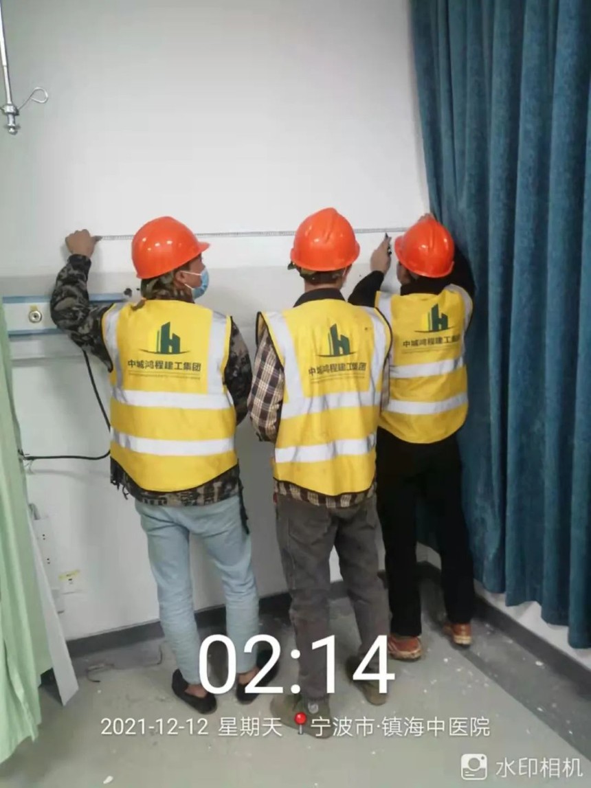 12月12日凌晨,接镇海区住房和建设交通局的通知,宁波市镇海区中医院病房需改造隔离出新冠定点隔离病房,且病房必须在12日中午12时前投入使用。时间紧任务重,接到电话后,相关负责人顾不上连日作战的疲惫,立马起身部署工作,由于事出突然,身边并不具备工作所要用到的人员及物资,又正值午夜凌晨,店铺并不营业,公司董事长亲自打电话给所熟识的供应商:“老李,这次任务非比寻常,耽误不起,你马上送一批物资过来,要快!”说完便又拨通了项目班组电话“葛工啊,还要你再辛苦一下,组织带领10余名工人,现在马上立刻赶赴宁波市镇海区中医院,那边需要紧急支援。”